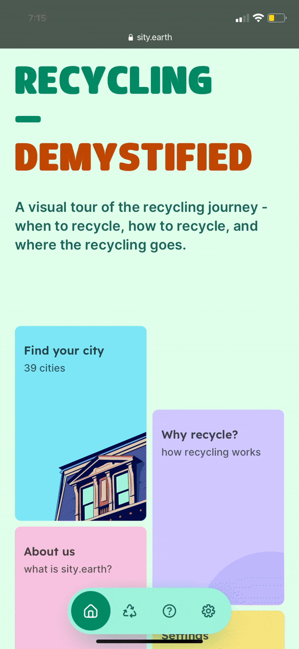 The wording for the button "categories" was not clear that it would lead to the different recycling categories. Finding your city's recycling guidelines should be a part of the home page for convenient access and a search bar would make the search process faster.