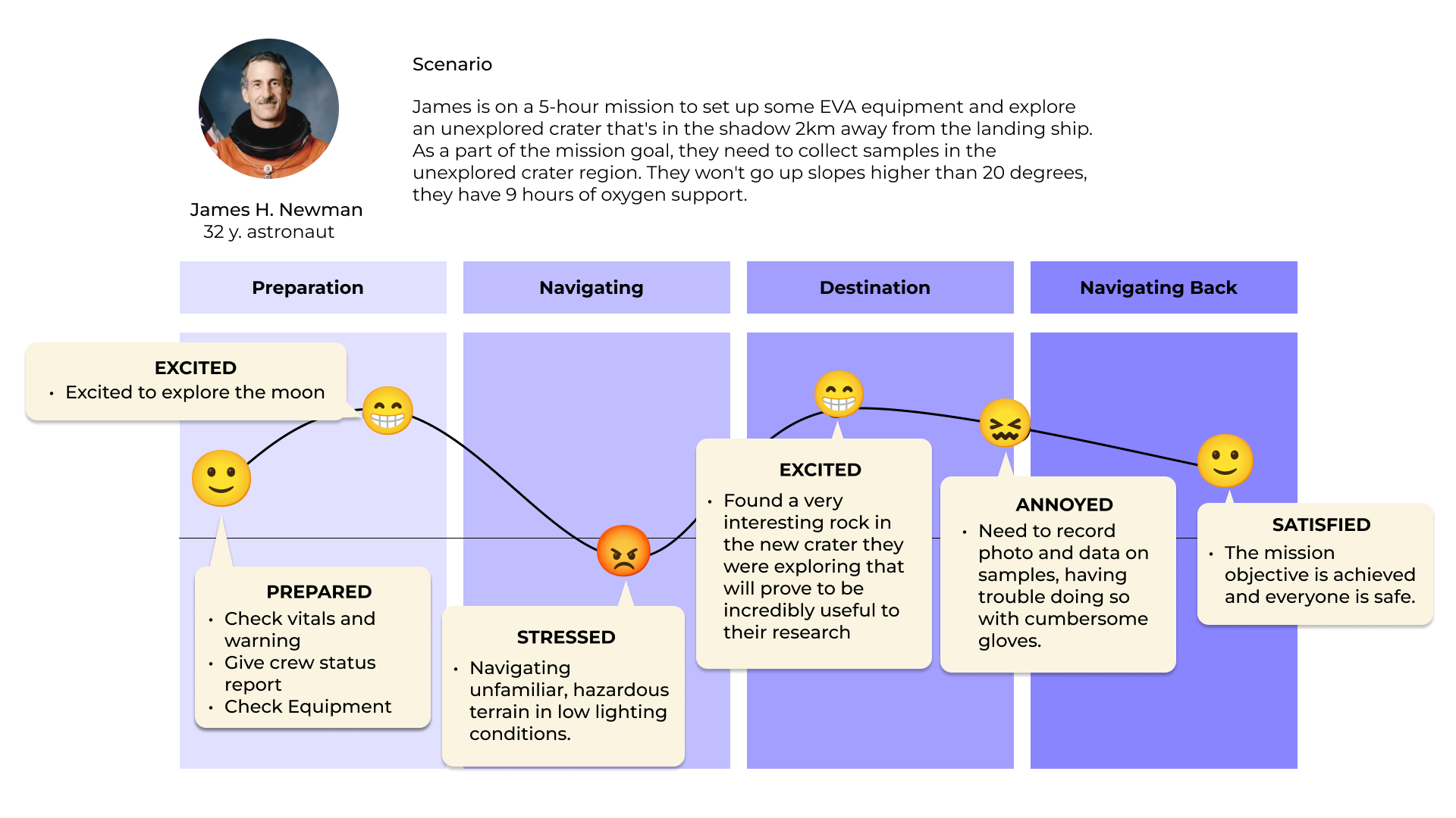 User journey maps created during interviews. Identifying the pain points and potential areas for design intervention during a lunar mission