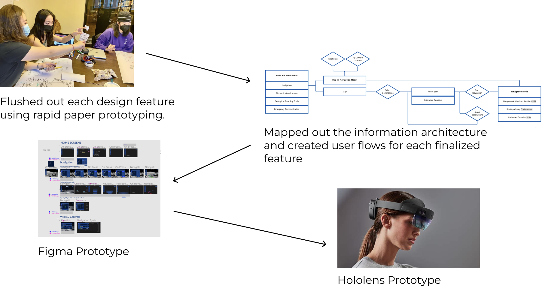 1) Interviewed NASA astronauts, planetary geology experts, and AR designers to understand lunar conditions, what it's like to be on a NASA lunar mission, and how best to design for AR environments.